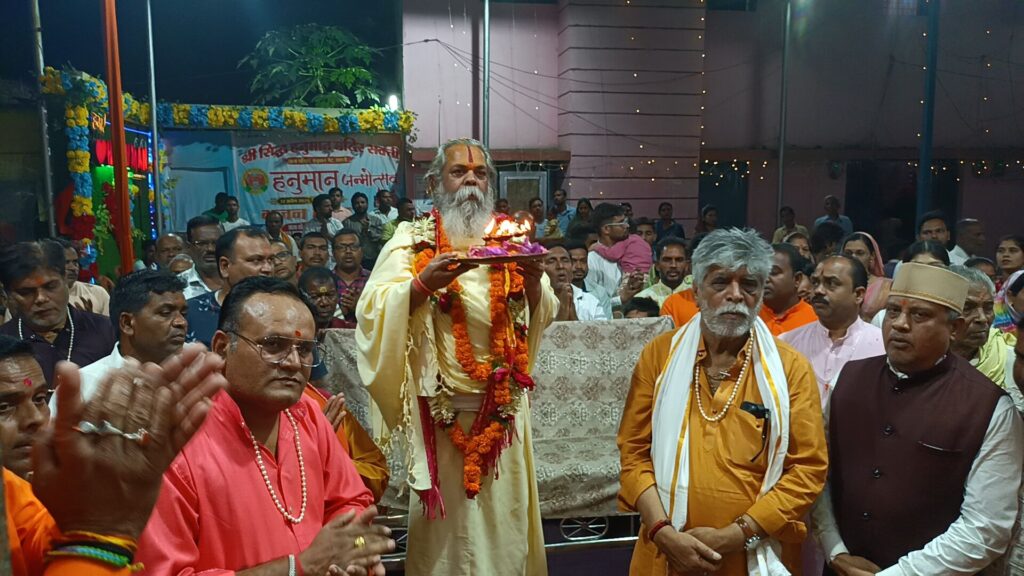 माँ महामाया के दर्शन कर फिर जयकारा के साथ भजन कीर्तन करते हुये साँई मंदिर, नवधा चौक होते हुये सक्ती के ह्रदय स्थल हनुमान गेट पहुँचे आतिशबाजी के साथ हाईकोर्ट अधिवक्ता चितरंजय पटेल जी ने पीठाधीश्वर को पुष्पहार से स्वागत किया और जयकारा के साथ हनुमान मंदिर परिवार के सभी सदस्यों के द्वारा सम्मान सहित मंदिर तक लेके आये अतिथियों ने हनुमान जी के चरणों मे माथा टेके फिर पुजारी ओमप्रकाश वैष्णव जी ने सभी को तिलक लगाया एवं हनुमान जी को सपर्स कर चुन्नी पीठाधीश्वर को भेट किये अन्य अतिथि जो बिलासपुर, चाँपा, कोरबा, बाराद्वार एवं सक्ती से शामिल हुए भाक्तो को मोती की माला से सम्मान किये फिर सभी को ससम्मान सोफे पर बैठाया गया इधर पुजारी जी ने पट बंद कर हनुमान जी का वस्त्र श्रृंगार करनें में जुट गये कुछ समय बाद पट खुला तो सभी ने श्री सिद्ध हनुमान जी का अवलोकिक श्रृंगार के दर्शन प्राप्त हुआ फिर गणेश वंदना की गई एवं पंच दीप गणेश आरती पीठाधीश्वर जी ने किया एवं कुछ समय के बाद 51 दीपो से सजी महाआरती की शुरुआत आदरणीय पीठाधीश्वर जी महाराज के द्वारा की गई एवं उसके बाद साथ मे आये सभी अतिथियों के द्वारा बारी बारी किया गया फिर सभी भक्तो के द्वारा किया गया आरती पूर्ण होते ही सामूहिक हनुमान चालीसा का पाठ किया गया फिर आदरणीय अतिथि गर्भ गृह में जाके हनुमान जी के चरणों में अपना शिश नवाये पुजारी ओमप्रकाश वैष्णव जी ने पीठाधीश्वर को तिलक कर श्री सिद्ध हनुमान जी की छाया छवि भेट किये श्री राम सुंदर दास जी ने सभी भक्तो को आशीर्वचन दिये बतलाये की पिछले 2 वर्षों के प्रयास के बाद आज 101 महाआरती में हनुमान जी की कृपा बनी तब यहाँ पहुँच पाया फिर प्रसाद ग्रहण कर मंदिर से बाहर आये मंदिर के पास ही मयंक ठाकुर एवं मित्रों के द्वारा गौ सेवा समिति के सेल्टर के निरक्षण के लिये गये मयंक ठाकुर ने बतलाया कि पीढ़ी जख्मी गौ माता एवं पशुओं को सेल्टर में लाकर इलाज किया जाता है। पीठाधीश्वर ने इस कार्य के लिये बहुत प्रशंसा किये और इसमे कुछ आगे की योजना हेतु रायपुर आने का सुझाव दिये कार्यक्रम के अंत मे सभी हनुमान मंदिर के भक्तों ने अतिथि राजेश्री महन्त रामसुन्दर दास जी महाराज जी के साथ सामूहिक तस्वीर लिये एवं स सम्मान विदाई दिये