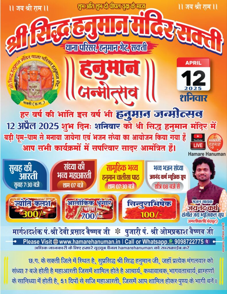 12 अप्रैल 2025 दिन शनिवार को सक्ति के श्री सिद्ध हनुमान मंदिर में बड़ी धूमधाम से मनाया जाएगा हनुमान जी का जन्म उत्सव इसकी तैयारी में जुटे पूरे श्री सिद्ध हनुमान मंदिर परिवार के सदस्य।
