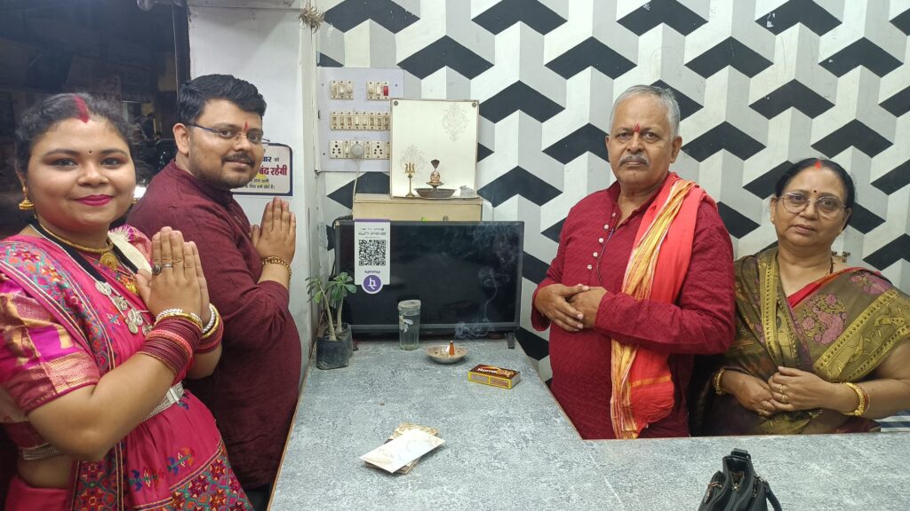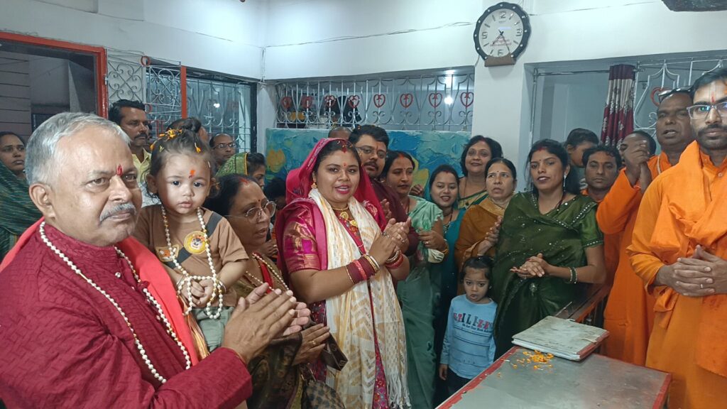 - पति मनीष दूबे, ससुर बद्रीनारायण दूबे एवं नन्हे पुत्र आद्विक दूबे का स्वागत पुजारी ओमप्रकाश वैष्णव ने तिलक लगाकर और माला पहनाकर किया।