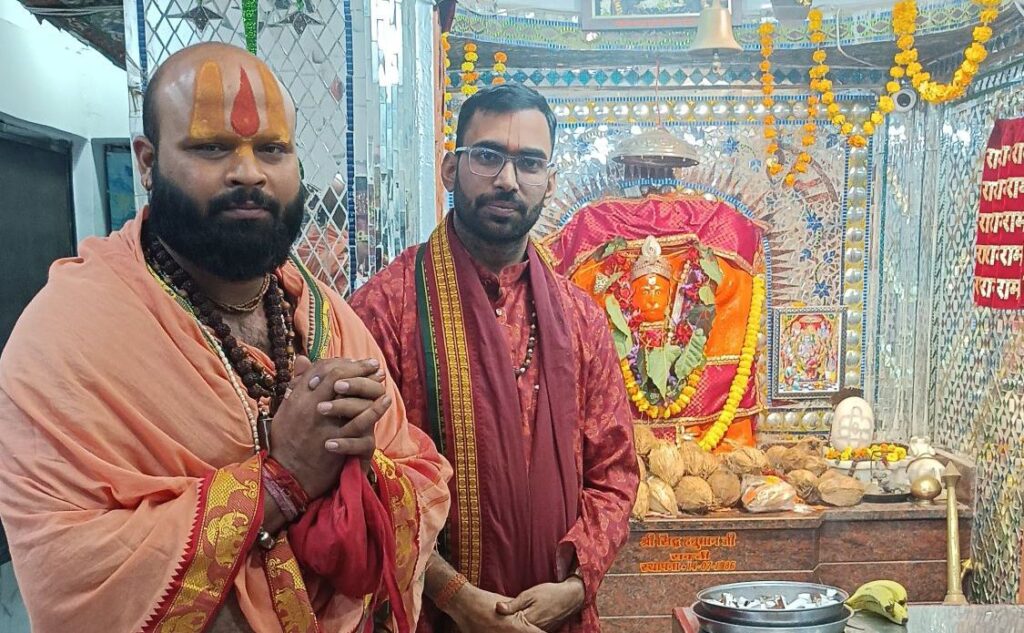 मंदिर परिसर में पुजारी पंडित ओमप्रकाश वैष्णव जी द्वारा महाराज जी एवं उनके साथ पधारे सभी अतिथियों का तिलक, माला एवं चुनरी पहनाकर आत्मीय स्वागत किया गया।