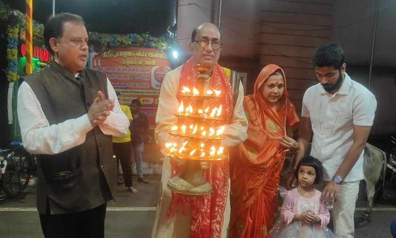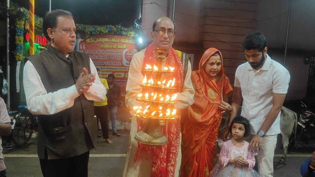इस महाआरती में परम आदरणीय पंडित श्री घनश्याम पांडेय जी एवं उनके परिवार का श्री सिद्ध हनुमान मंदिर परिवार द्वारा हार्दिक स्वागत एवं वंदन-अभिनंदन किया गया। मंदिर परिसर में परम आदरणीय पंडित श्री ओमप्रकाश वैष्णव जी ने तिलक एवं चुनरी पहनाकर विशेष सम्मान किया।