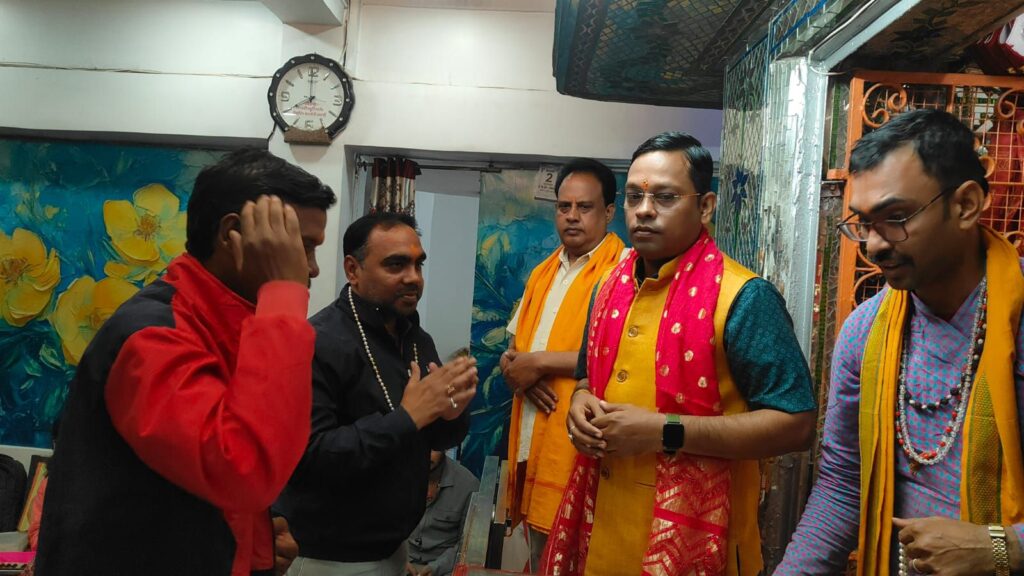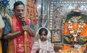 मंदिर में पुजारी पंडित श्री ओमप्रकाश वैष्णव जी ने महाराज श्री सुरेश पांडेय जी का तिलक चुनरी से व उनकी धर्मपत्नी एवं बच्चों का मोति माला से सत्कार किया।